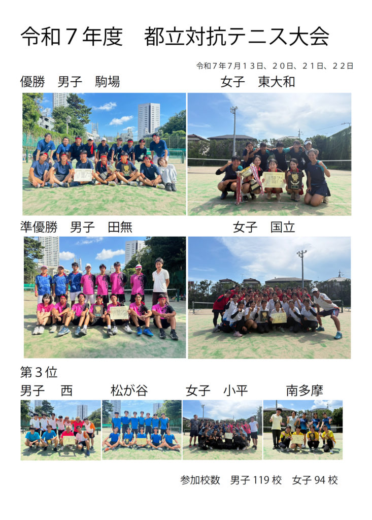 令和7年度 都立対抗テニス大会結果 8/25講習会 都立対抗テニス大会 2025.08.03 令和7年度 都立対抗テニス大会が終了しました。酷暑の中熱戦が繰り広げられました。男子は4年連続駒場と田無の決勝となり、駒場が3連覇しました。女子は東大和が2年ぶり9回目の優勝を果たしました。トーナメント表の結果はこちらから(詳細結果は後日掲載致します)。8月25日にウィンザーラケットショップ主催の講習会を実施します。 実施要項 申込フォーム 送付はこちら「その他の情報」にも掲載しています。